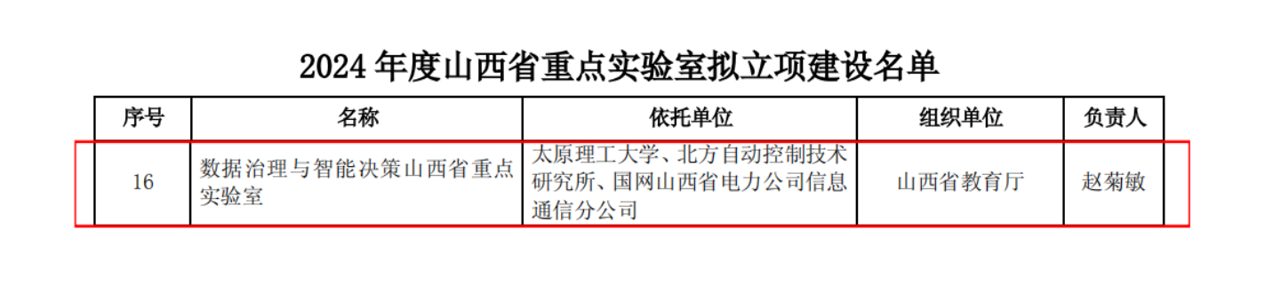 其中,我院赵菊敏教授团队原“大数据融合分析与应用山西省重点实验室”,重组为“数据治理与智能决策山西省重点实验室”。数据治理与智能决策山西省重点实验室重组成功,大大提升了我院在高质量科研成果、高价值仪器设备和高层次科研人才的集聚能力,进一步促进了山西省在全国科技创新体系中的竞争力。