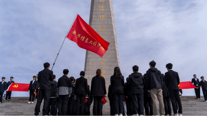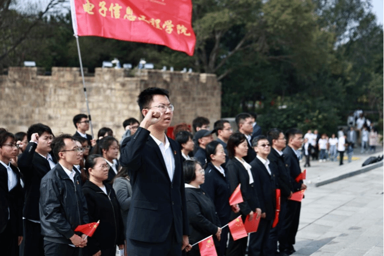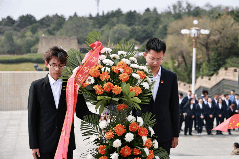 在敬献花束环节,全体人员从纪念碑左侧有序上前,将手中的白菊轻轻摆放在献花平台,绕行瞻仰纪念碑,每一步都饱含着对先烈的追思。在朱晋华书记的领誓下,全体党员面向党旗,举起右拳,重温入党誓词。随后,全体团员在院团委学生副书记张鼎崴的带领下,重温入团誓词,青春的誓言与历史的回响交织,彰显着新时代青年继承先烈遗志的坚定决心。