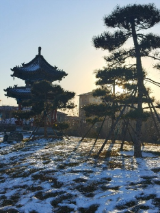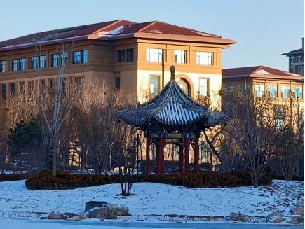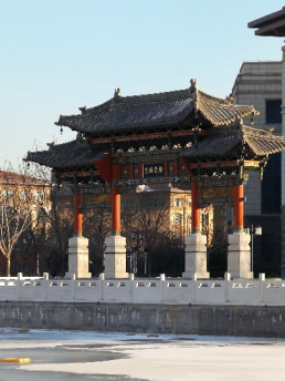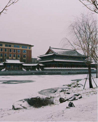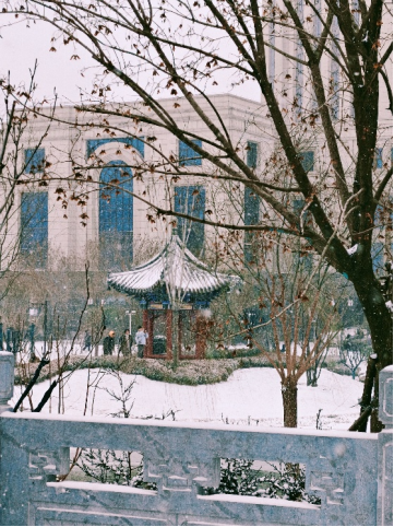 明向湖的冬,是半冰半水的温柔:红墙飞檐落了雪,冰面裂出的水痕漏着深绿,是冬没藏好的心事。流水撞着覆雪石景,风都慢下来听这轻响;亭台裹着银霜,与暖光漫窗的教学楼遥遥相对,枝桠剪碎落雪,把天地的白晕成浸着诗意的画。雪裹了岸、静了柳,连石阶绒白里,都藏着初雪的软。