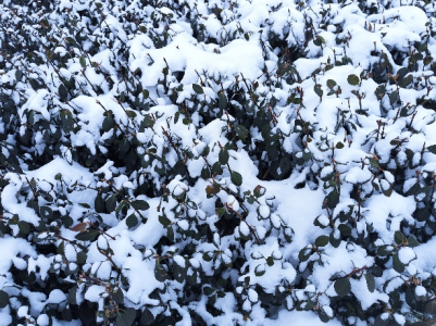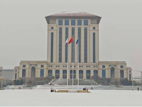 米黄外墙接了层薄雪,玻璃幕墙映着流云般的雪絮,连台阶的缝隙里都积了绒绒的白。
