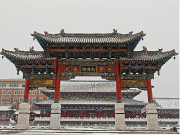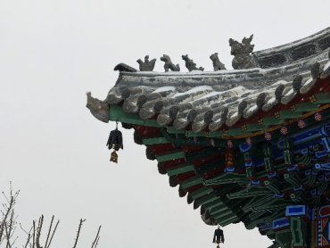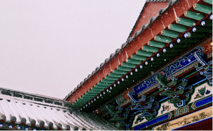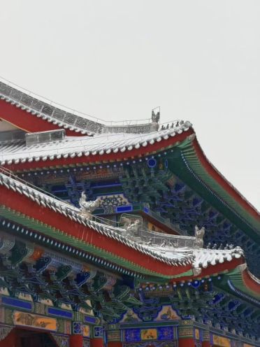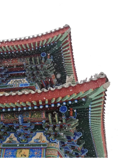 雪絮落在飞檐彩画上,将青蓝与朱红晕得温软。斗拱纹路裹着细雪,檐角瑞兽驮着银霜,悬铃浸在冷雾里 —— 古意与落雪撞个满怀,每道纹路都藏着太理冬的细腻。抬眼时雪从檐角漏下,又给这建筑添了笔轻软的诗意。