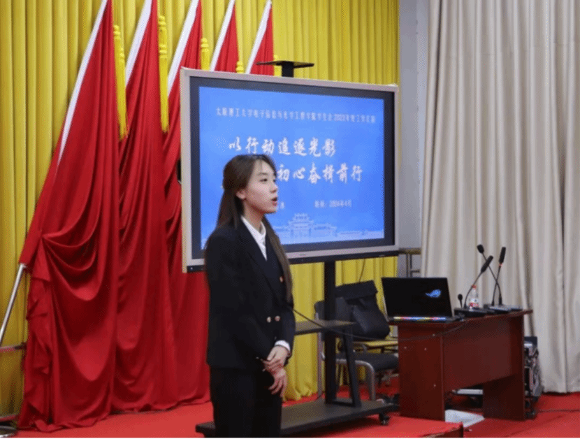 成若冰同学自入学以来,始终坚定不移地拥护党的领导,积极向党组织靠拢,光荣地成为一名中共预备党员。她以身作则,担任通信2102团支部组织委员及院学生会临时团支部组织委员,带领同学们举办深入学习习近平新时代中国特色社会主义思想的读书会,增强“四个意识”,坚定“四个自信”,做到“两个维护”。在她的带动下,班级及学生会的党建工作有声有色,形成了浓厚的学习氛围和良好的政治生态。